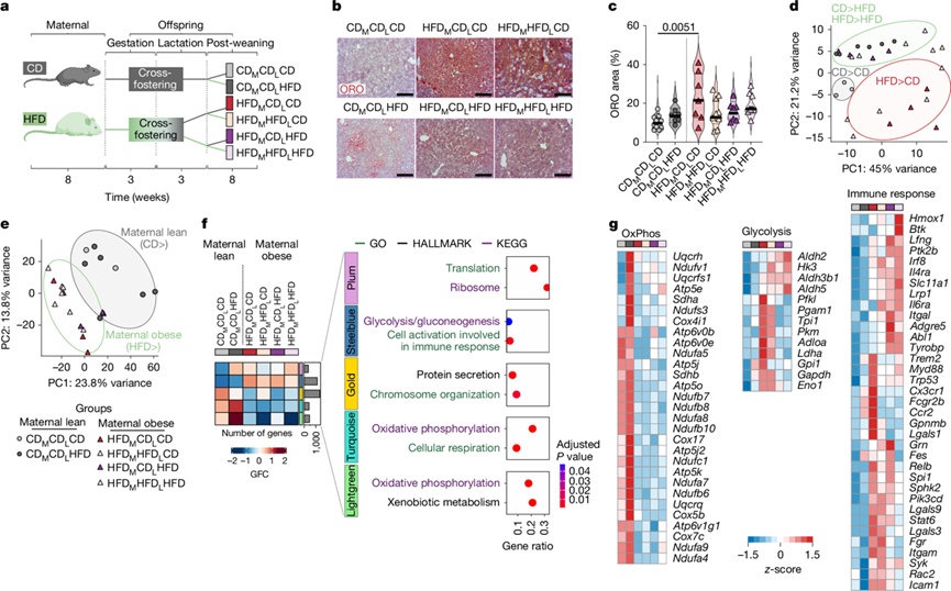 (a) 母体肥胖小鼠模型的产生。(b) 子代肝脏的 ORO 染色。(c) 通过 QuPath 对(b)的 ORO 染色进行定量。(d) 通过 PCA 可视化所有实验组的肝脏脂质组数据。(e) 通过 PCA 可视化排序的 KC 的RNA-seq 数据。(f) 共表达网络分析。 (g) (f)中 DEG 与相应注释基因集交集的选定基因的热图。