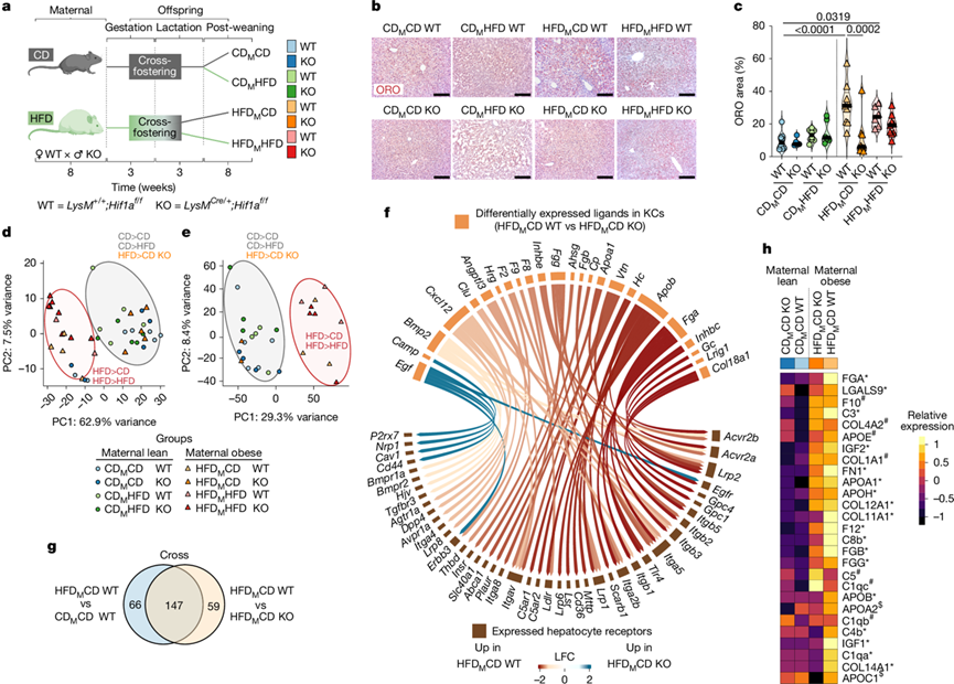 (a) 通过髓系Hif1a敲除建立母体肥胖模型。(b) 代表性肝脏ORO 染色。(c) 通过 QuPath 对(b)的 ORO 染色进行定量。(d) 通过 PCA 可视化肝脏脂质组学数据。(e) 通过 PCA 可视化的RNA-seq数据。(f) 弦图显示肝细胞表达的KC 配体及其各自的受体。(g) 差异表达蛋白分析。(h) 热图显示(g)中选定的蛋白质。