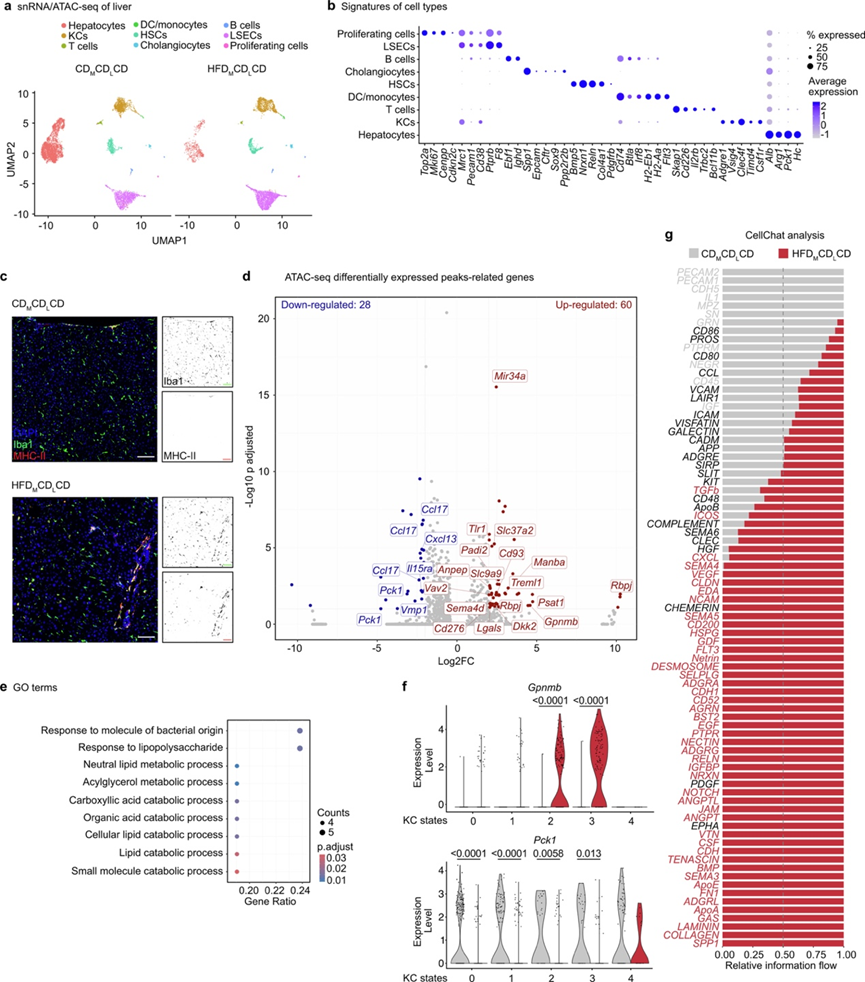 (a) UMAP可视化。(b) 点阵图显示了决定细胞类型的基因。(c) 免疫荧光分析。(d) 火山图显示分配给 CDMCDLCD 和 HFDMCDLCD 肝脏的 KC 之间差异检测到的 snATAC-seq 峰的基因。(e)GO分析。(f) 所有KC状态下Gpnmb(上)和Pck1 (下)的表达。(g) CellChat分析。