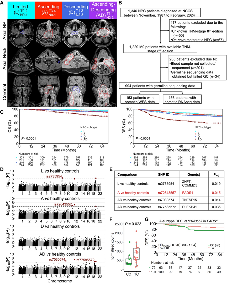 (A) 与 NPC 亚型相关的临床特征和种系变异。(B) NCCS 队列患者选择的 CONSORT 图。(C) NCCS 队列患者选择的 CONSORT 图。(D) 曼哈顿图显示与 L、A、D 或 AD 亚型相关的生殖系变异相对于健康对照的p值。(E) 在与健康对照和所有对照的比较中,发现与 NPC 亚型显著相关的变体。(F-G) rs72643557基因型为 CC 和 TC 的 A 亚型患者的肿瘤FADS1和 DFS表达情况。