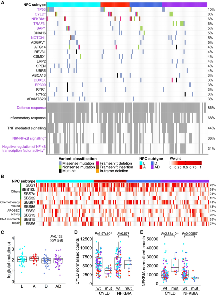 接下来,鉴于 NF-κB 通路在 NPC 中的重要性,他们选择关注在CYLD和NFKBIA (NF-κB 抑制因子α)基因中发现的突变,并研究了这些基因内突变相对于不同亚型的位置。值得注意的是,CYLD和NFKBIA均作为 NF-κB 通路的负调节因子发挥作用。对于CYLD,12个突变中有 9 个定位于肽酶 C19N 和第三个富含甘氨酸的细胞骨架相关蛋白 (CAP-Gly) 结构域,这些结构域在各个亚型中均匀分布。对于NFKBIA,9 个突变中有 5 个定位于锚蛋白 (ANK) 2 和 ANK5 结构域,9 个突变中有 4 个发生在具有 D 亚型的患者中。他们进一步探讨了这些突变对具有配对转录组数据的患者基因表达的下游影响(图 2D-E)。CYLD 突变与CYLD表达降低相关,但矛盾的是,也与NFKBIA表达增加相关,而NFKBIA突变仅影响NKBIA表达,而不影响CYLD表达;这些结果表明CYLD和NFKBIA表达与CYLD敲低之间存在相互依赖性。