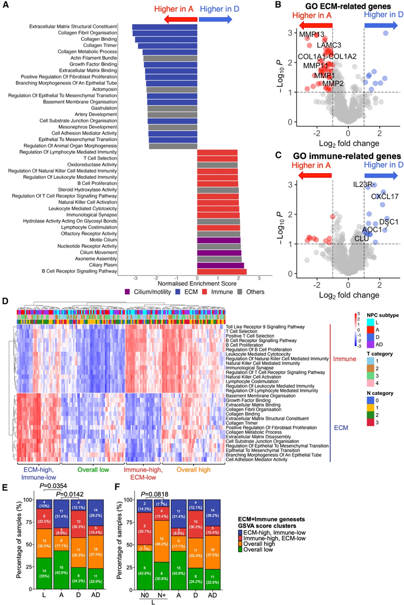 (A) 根据整个转录组谱,在 A 亚型和 D 亚型肿瘤中富集的基因集。(B-C) 差异表达基因。(D) 分别针对从 GSEA 中识别出的前 15 个 ECM 基因集和前 15 个免疫相关基因集的所有 NPC 亚型的表达热图。(E-F) 各鼻咽癌亚型在中定义的 GSVA 评分聚类中所占比例,并使用卡方检验对各亚型进行比较。
