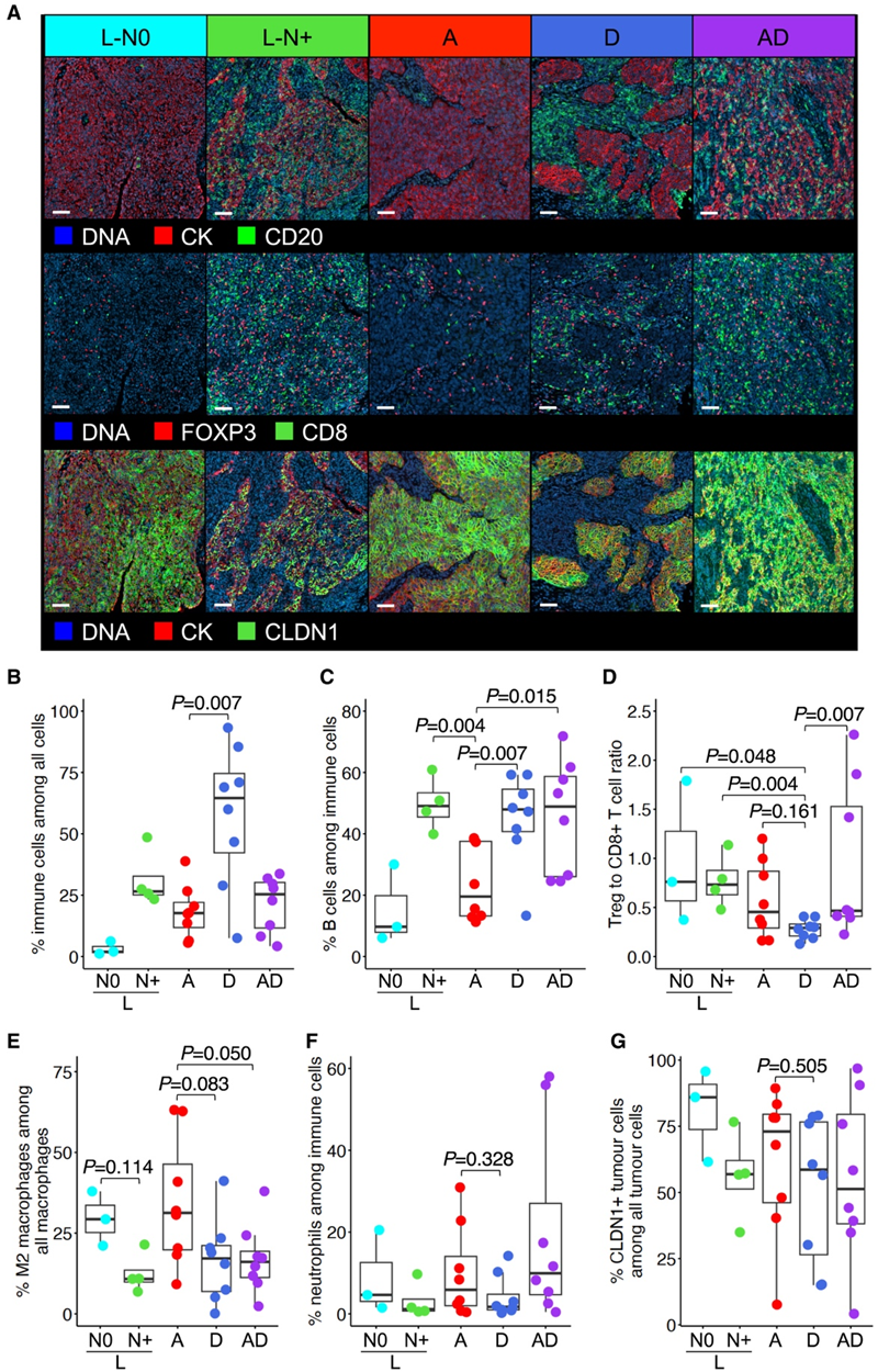 为了进一步表征 A 型和 D 亚型 NPC 免疫评分的显著差异,他们对一组肿瘤 (3 [N0 L]、4 [N+ L]、8 [A]、8 [D] 和 8 [AD]) 进行了多重免疫组织化学 (mIHC),使用了一组肿瘤和免疫相关标志物,包括 CK、CD4、CD8、CD20、FOXP3、CD68 和 CLDN1(参与调节免疫细胞运输并在头颈癌中过表达的紧密连接蛋白)。首先,他们再次看到 A 亚型肿瘤的免疫细胞丰度低于 D 型和 AD 亚型肿瘤(图 5 A-C)。这对应于 D 亚型肿瘤在不同亚型中表现出最低的 Treg 与 CD8+ T 细胞比率(图 5 D)。其次,比较髓系细胞类型,未发现它们之间存在显著差异(图 5E-F)。虽然大多数肿瘤(无论亚型如何)均对 CLDN1 染色呈阳性,但这种阳性在 N0 L 型和 A 型肿瘤中最为明显(图 5G)。