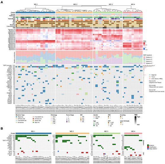 (A) 上:基于突变特征的肝胆肿瘤组织和类器官分类以及相关的临床病理特征以及总突变负荷。中:显示了本项研究的数据的上下文特定突变谱与 COSMIC 数据库中的 MS 之间的皮尔逊相关系数 (PCC),并附有堆叠条形图,其中显示了每个患者的每个非负矩阵分解 (NMF) 特征的贡献。下:肝胆肿瘤组织和类器官中主要癌症相关基因的遗传图谱(左)。条形图显示了这些基因在肝胆肿瘤组织、类器官和 TCGA 中的改变频率。计算了肿瘤组织、类器官和 TCGA 之间基因频率的 Pearson 相关性(右)。(B) Oncoplot 显示了每个基于 MS 的肝胆肿瘤类器官中最重要的癌症相关基因的基因组特征。