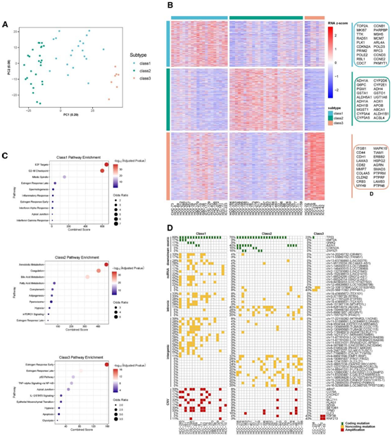 (A) 对所有样本中 2000 个表达差异最大的蛋白质编码基因的 mRNA 表达值进行主成分分析 (PCA)。(B) 每个亚组差异表达基因的热图。(C) 每个亚组中显著差异表达基因的富集通路。(D) 条形图显示基于 mRNA 亚型的肝胆类器官中癌症相关基因的基因组特征。