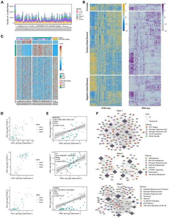 (A) 来自所有样本的 ATAC-seq 数据的精选峰调用数量。颜色表示峰重叠的基因组区域的类型。(B) ATAC-seq 启动子、ATAC-seq 远端元件(左)和所有基因的 RNA-seq(右)的 Pearson 相关热图。(C) 基于 mRNA 分类的 4266 个亚组特异性峰的热图表示。(D) 亚组特异性基因峰与基因链接的 ATAC-seq 可及性和 RNA-seq 基因表达的点图。(E) MAP3K5 基因、CP 基因或 LAMC2 基因的峰到基因链接的 ATAC-seq 可及性和 RNA-seq 基因表达的点图。(F) 亚组特异性转录因子 (TF)-靶基因 (TG) 基因网络,注释有每个亚组中丰富的通路。