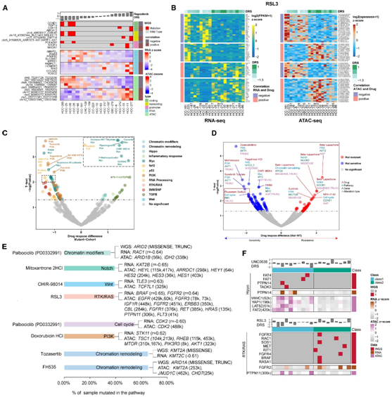 (A) 热图显示与瑞戈非尼反应相关的顶级预测突变、表达和 ATAC-seq 可及性特征。(B) RNA-seq 和 ATAC-seq 之间预测 RSL3 响应的集成分析的热图表示。(C) 组合基因组相互作用的火山图。(D) 火山图代表信号通路-药物相互作用中关键突变的大小(药物反应差异)和显著性。(E) 信号水平基因组特征满足给定药物敏感性组合模型的肝胆肿瘤类器官的百分比。(F) 热图显示基于 RNA 分类的肝胆肿瘤的亚组特异性药理学特征和个体治疗方法。