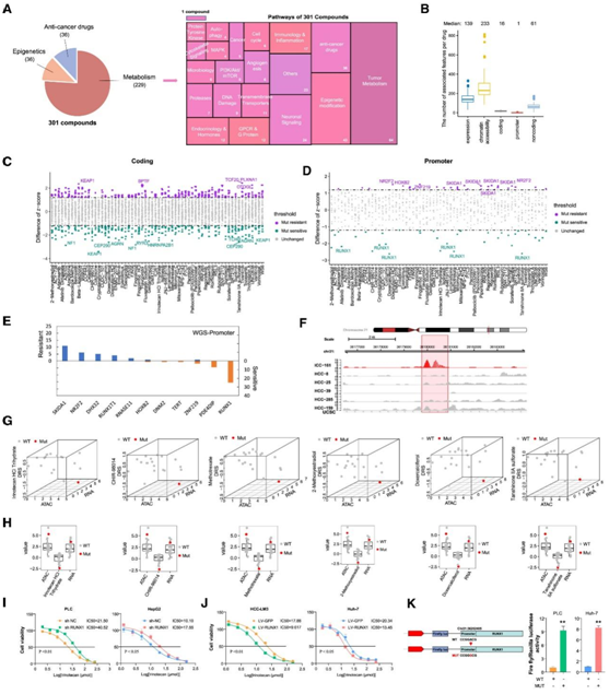 (A) 301 种筛选药物根据其治疗靶点、主要效应途径和细胞功能进行分类。(B) 箱线图显示每种药物的相关特征数量。(C-D) 散点图代表独特遗传特征-药物对之间具有统计显著性的相互作用。(E) 条形图显示肝胆肿瘤类器官中启动子突变的药物基因组相互作用。(F) RUNX1 启动子基因座处 6 个类器官样本的标准化 ATAC-seq 测序轨迹。(G-H) 本研究中描述的肝胆肿瘤类器官的归一化 ATAC-seq、RNA-seq 和药物反应。(I-J) 用增加浓度的伊立替康处理所示细胞系 72 小时,并计算它们的细胞存活曲线。(K) WT 或突变体(chr21_36262405 A-to-G 突变)RUNX1 启动子在用相应质粒转染的 PLC/Huh-7 细胞中的相对荧光素酶活性。