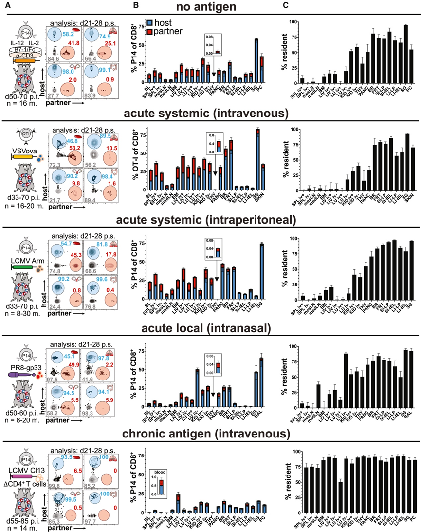 研究团队建立了小鼠模型,从经历过免疫反应的小鼠的几乎每个固体器官和屏障部位都可以分离出记忆CD8+ T细胞。他们研究了 23 个解剖区室,以了解迁移特性在器官和组织中的差异。由于局部抗原水平会影响 T 细胞分化和组织驻留,他们利用了五种不同的启动方式,这些代表了抗原分布或持续时间的范围。为了模拟不存在抗原的情况,他们首先在体外刺激幼稚的 Thy1.1 +或 CD45.1+同源标记的 P14 T 细胞(针对免疫显性淋巴细胞脉络丛脑膜炎病毒 [LCMV] 表位 gp33),然后转移到幼稚的受体中。转移后 50 至 60 天,通过异体共生手术将具有 Thy1.1+ P14 细胞的小鼠与具有 CD45.1+ P14 细胞的小鼠连接起来(图 1 A)。休息 21-28 天后,对异体共生体进行血管内 (iv) 抗体染色。然后收集组织,分离和染色细胞,识别宿主和配对来源的细胞,并计算驻留细胞的比例(图 1B-C)。