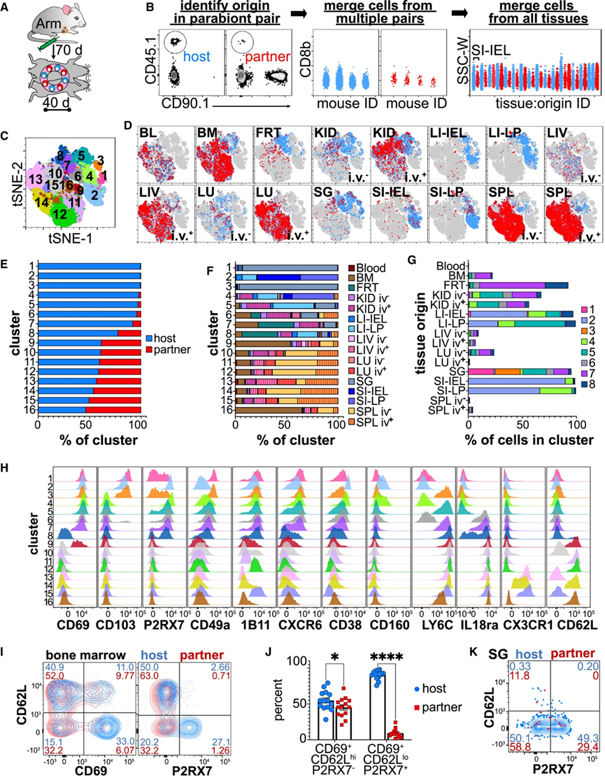 接下来,他们确定了每个亚群的组织和共生体起源。PhenoGraph 明确区分了一些组织驻留细胞群(聚类 1-6)(图 4 D-E)和平衡群体(宿主和配对衍生细胞数量大致相等)(聚类 9-16)(图 4 D-E)。一些 Trm 细胞表型是组织特异性的,特别是在唾液腺内,而一些(例如聚类 6;CD69 + P2RX7 + CD49a + CXCR6 + CD62L−)是许多组织所共有的,包括脾脏(图4D-F)。然而,单个组织中的 Trm 细胞可以表现出广泛的异质性(图 4 G)。此外,有些聚类(例如聚类 7 和聚类 8)同时包含驻留细胞和平衡细胞。因此,在 SPF 小鼠中 LCMV Arm 感染的背景下,这 12 个标记物虽然有用,但不足以完全区分持久的 Trm 细胞和在异体共生平衡阶段到达组织的配对衍生细胞(称为“新来者”)。额外的标记物比单独的 CD69 更有效。例如,P2X 嘌呤受体 7 (P2RX7) 和 L-选择素 (CD62L) 进一步分辨了骨髓中的驻留细胞和平衡 CD69 +细胞(图 4 I-J)。然而,P2RX7 并未在唾液腺中的许多 Trm 细胞上表达(图 4 K)。