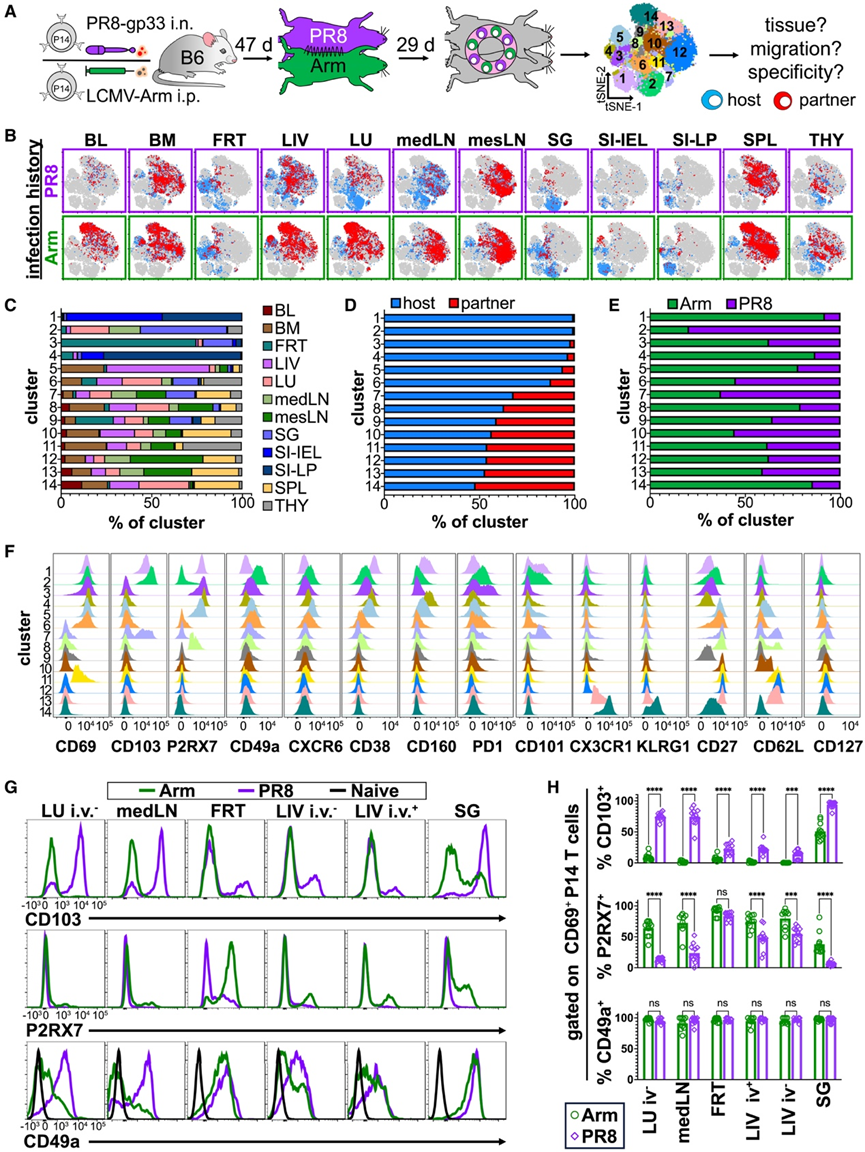 (A)实验方案。(B) 每种组织和感染的宿主和配对衍生细胞。(C-E) 从最多(上)到最少(下)聚类的百分比。(F) 用于聚类输入标记的表达直方图。 (G) 指示标记的代表性表达直方图。(H) 表达指示标志物的 CD69+ P14 细胞百分比。