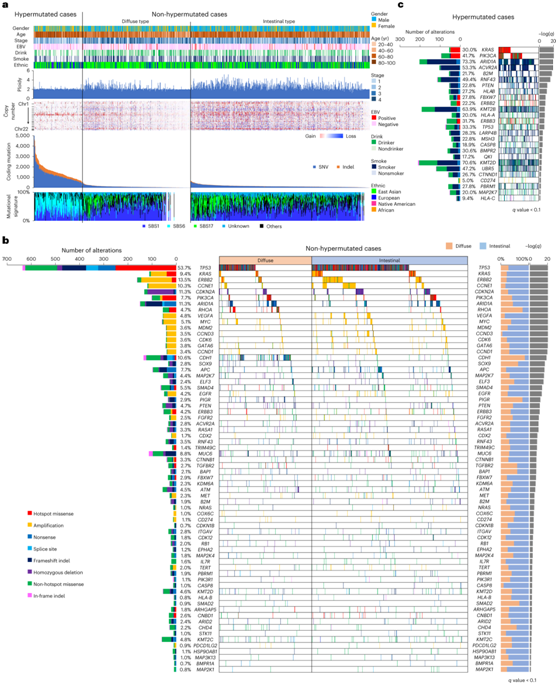 本项研究报告了胃癌驱动事件的广泛、多祖先景观,涉及 1335 例病例。鉴定出 77 个SMG,包括ARHGAP5和TRIM49C,还确定了亚型特异性驱动因子,包括PIGR和SOX9,它们在疾病的弥漫性亚型中富集。SMG 还根据 Epstein-Barr 病毒感染状态和血统而变化。非蛋白质截短的CDH1突变的特点是剪接改变,靶向局部细胞外结构域,并且独特地发生在散发性弥漫型病例中。在东亚血统的胃癌患者中,饮酒或新陈代谢与RHOA突变的发生之间存在联系。此外,还确定了在免疫逃避中具有潜在作用的突变。总体而言,这些数据提供了对不同亚型和血统的胃癌分子景观的全面见解。