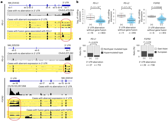 (a) PD-L1、PD-L2和FGFR2 3'UTR异常的典型病例的RNA-seq读取深度。 (b) 3'UTR畸变阳性和阴性病例之间编码表达的比较。(c) 超突变和非超突变病例之间PD-L1 3'UTR改变病例的数量比较。(d) 欧洲和东亚血统病例之间FGFR2 3'UTR改变病例数的比较。