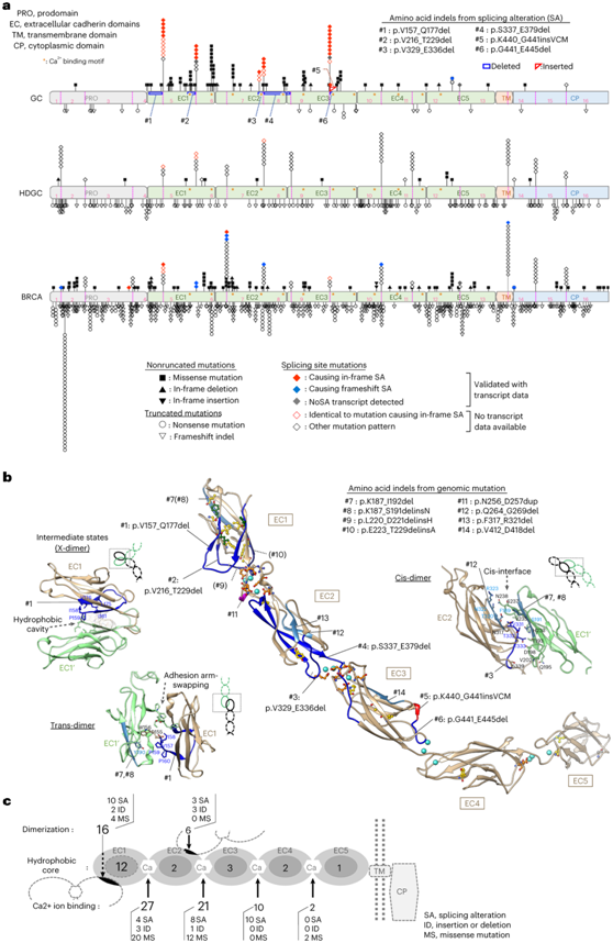 (a) 代表CDH1结构域和CDH1突变分布的示意图。 (b) 使用小鼠CDH1(PDB3q2v)作为模板建模的人CDH1蛋白中非蛋白截短突变的分布。(c) 每个功能区域中检测到的非蛋白质截短突变数量的汇总图。
