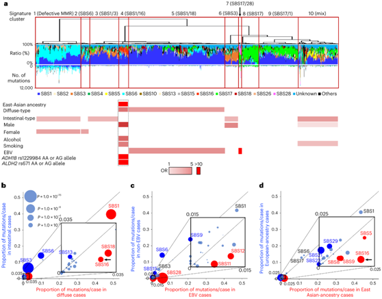 突变特征根据疾病亚型、EBV 感染状态和血统而变化(图6a-d)。SBS18 COSMIC 突变特征(可能归因于活性氧的损伤)和 SBS16(未知病因)是弥漫性亚型的特征(图6b)。比之下,SBS3(与基于同源重组的 DNA 损伤修复缺陷相关)在肠道亚型中更为常见(图6b)。SBS28(病因不明)、SBS11(与替莫唑胺治疗相关)和SBS12(病因不明)在EBV阳性病例中更为常见(图6c)。SBS16更常导致弥漫型和东亚血统的病例,并与饮酒有关(图6d)。
