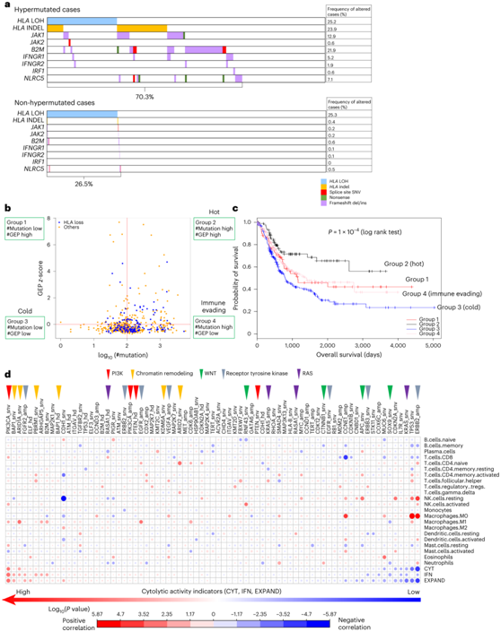 (b) 根据肿瘤突变负荷(TMB)和T细胞炎症基因表达谱(GEP)联合对病例进行分类,以表征免疫基因组亚型。(c) TMBhigh GEPhigh组中的病例富含抗 PD-1 治疗的反应者,显示出明显优于其他患者的预后。 (d) 基因突变和免疫特征之间的关联。