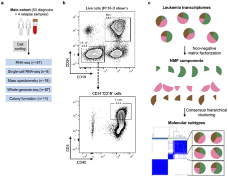 (a)主要队列的研究设计。(b)白血病母细胞和 T 细胞的荧光激活细胞分选方案示例。(c)结合非负矩阵分解(NMF)和一致层次聚类的RNA-seq聚类方法。
