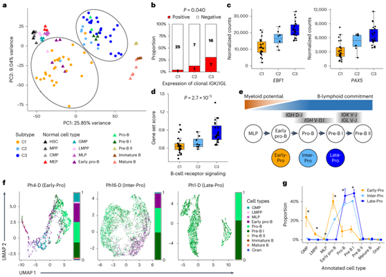(a) 主成分分析(PCA)。 (b) 克隆重排免疫球蛋白轻链基因(IGK、IGL)表达和不表达的各亚型白血病的比例。(c) B细胞发育基因EBF1和PAX5按亚型归一化计数。 (d) B细胞受体信号转导的基因集评分。(e) 与B细胞分化阶段相关的分子亚型的大致定位。 (f) 来自scRNA-seq的单细胞与最接近的正常细胞对应物进行注释,并使用UMAP进行可视化。 (g) 每个亚型中细胞类型注释的比例。