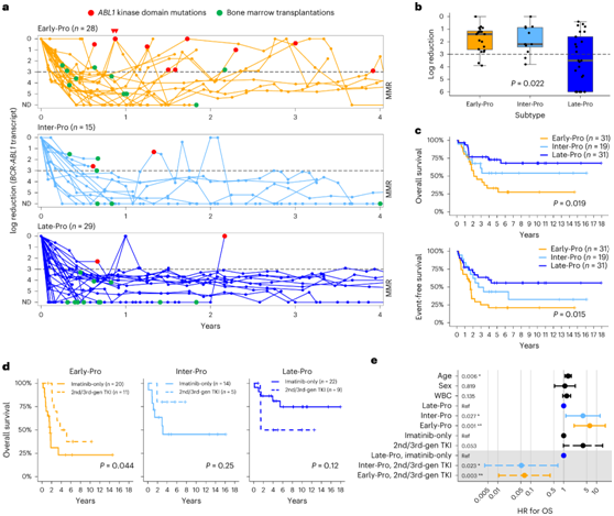 (a) 每个亚型的BCR-ABL1转录物水平对数减少的残留疾病图。 (b) 诱导治疗后(诊断后最多60天)的首对数降低水平按亚型(20例Early-Pro, 12例Inter-Pro和25例Late-Pro患者)区分。 (c-d)生存分析。(e) 多变量Cox比例风险模型。