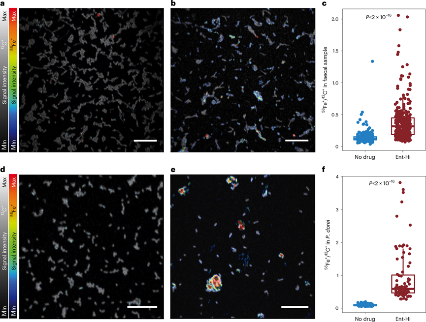 为了确定上述结果是否也适用于复杂的微生物群,他们在图1a所示的等效条件下培养粪便样本。与单独使用B. thetaiotaomicron获得的结果一致,向整个微生物群补充载铁的 ENT-Hi 或先补充 ENT-Hi 再补充铁,可完全或接近完全逆转对微生物生物量积累的抑制作用(图4c-d)。补充 Fe(III) 可逆转 ENT-Hi 对群落 alpha 多样性指标的影响,以及对几乎所有受影响最大的前 25 个分类单元的生长的影响(厚壁菌门如Anaerostipes和Blautia除外)(图4e-f)。补充铁不仅能使受恩他卡朋负面影响的分类群生长,而且似乎还能限制由 ENT-Hi 促使的大肠杆菌等生物的加速扩张(图1e,图5a-d)。重要的是,他们证实这种影响不是由于细胞吸收降低造成的,因为 ENT-Hi:Fe(III)在微生物细胞中的生物累积水平与 ENT-Hi 单独使用的水平相同或更高,从而表明 ENT-Hi:Fe(III)复合物在渗透和在细胞中积累的能力方面与恩他卡朋相似。微生物细胞和恩他卡朋蓄积菌种P. dorei在暴露于恩他卡朋时显示出比未暴露于恩他卡朋的细胞高得多的铁含量,这强烈表明 ENT-Hi:Fe(III)复合物是稳定的并能到达细胞空间(图5d-f)。然而,许多细胞可能由于无法从恩他卡朋复合物中释放铁而挨饿。总之,这些结果表明,恩他卡朋与限制性营养铁的络合是导致恩他卡朋对微生物组产生强烈抑制作用的主要机制。