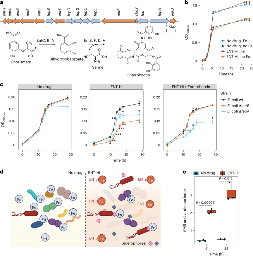 (a) 大肠杆菌D bin.187中肠杆菌素生物合成基因座的遗传组织。(b) 大肠杆菌分离株E2的生长情况。(c) 细菌生长情况分析。(d)实验设计示意图。(e) 无药物对照和恩他卡朋 (ENT-Hi) 处理样本的AMR 和毒力指数增加。