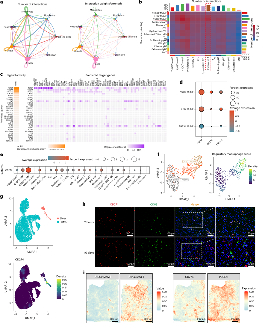 (a) 对移植猪肝中浸润的细胞类型进行 CellChat 分析,以评估与 T 细胞相互作用的主要细胞类型。(b) CellChat 包预测的猪肝中不同细胞群之间相互作用数量的热图。(c) 热图显示由 NicheNet 包计算的配体活性和调节潜力,用于分析 CTL 向耗竭 T 细胞的转换。(d) 点图显示预测诱导 CTL 向耗竭 T 细胞转变的三种配体的表达情况,这些配体在浸润到猪肝的单核细胞中。(e) 点图显示移植猪肝中所有细胞类型中 PD-L1(CD274)的表达水平。(f) UMAP 图和密度图显示单核细胞聚类中的调节性巨噬细胞评分。(g) UMAP 图和密度图显示从 PBMC 或移植猪肝中获得的单核细胞中 PD-L1(CD274)的表达。(h) 移植后 2 小时和 10 天移植猪肝组织中 CD274(红色,PD-L1)和 CD68(绿色)的免疫荧光染色代表性图像。(i) 使用空间转录组分析可视化移植后 10 天移植猪肝中的 PD-L1(CD274)和 PDCD1 表达。