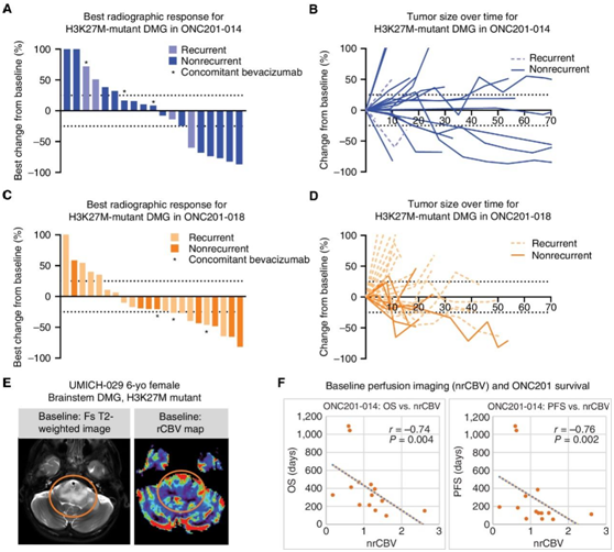 (A-B)瀑布图和蜘蛛图代表来自ONC201-014的H3K27M-DMG患者对ONC201的放射反应。(C-D)瀑布和蜘蛛图表示来自ONC201-018的H3K27M-DMG患者对ONC201的放射学反应。(E)来自 UMICH-029 的代表性动态磁敏感对比灌注 MRI 图像。(F) ONC201-014 的 H3K27M-DMG 中标准化相对脑血量(X轴)与 OS(左)或 PFS(右)之间的相关性。