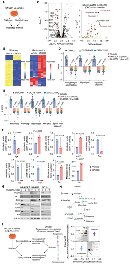 (A)H3.3K27M DIPG007 细胞用载体或 5 μmol/L ONC201 处理 48 小时,然后进行 RNA-seq 和代谢组学分析。(B)热图显示 ONC201 与载体处理后 RNA-seq(左)和代谢物(右)的上调和下调基因。(C)下调基因的综合结果表示为火山图和途径影响分析图。(D)H3.3K27M-DMG 细胞中糖酵解应激测试的 Seahorse 数据。(E) H3.3K27M-DMG 细胞氧化磷酸化应激测试的 Seahorse 数据。(E) H3.3K27M-DMG 细胞氧化磷酸化应激测试的 Seahorse 数据。(G)免疫印迹分析。(H) 糖酵解和 TCA 循环代谢的示意图。(I)将A中 ONC201 或载体处理的 DIPG007 细胞中的 RNA-seq 数据。