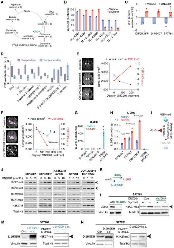 (A)[13C5 ]-谷氨酰胺追踪到 TCA 循环的示意图,表明每种代谢物的预测质量同位素。(B)条形图显示用载体(蓝色)或 5 μmol/L ONC201(红色)处理 48 小时的 H3.3K27M DIPG-007 细胞中各种代谢物。(C)条形图显示用载体(蓝色)或 5 μmol/L ONC201 处理的 H3.3K27M DIPGXIII*P、DIPG-007 和 SF7761 细胞中 2HG 水平(Y轴、Z 分数,通过 LC-MS 测量)(红色)48 小时。(D)箱线图,显示来自 ONC201 治疗的 H3K27M-DMG 患者的 CSF 样本中的代谢物测量值。(E)响应者患者 UMICH-006 的肿瘤面积(左Y轴,紫线)和 CSF 2HG 水平(右Y轴,红线)。(F)无反应患者 UMICH-022 的肿瘤面积和 CSF 2HG 水平。(G-H)对映体特异性质谱分析。(I)卡通图显示 L-2HG 抑制 Jumonji C (JmjC) 结构域组蛋白赖氨酸去甲基化酶,导致组蛋白甲基化增加。(J-N)免疫印迹分析。