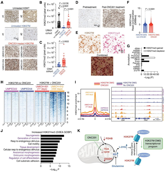 这些数据表明,通过 IHC 和基因组检测,ONC201 治疗会增加 H3K27M-DMG 患者中 H3K27M 肿瘤细胞的 H3K27me3 水平(图7K)。