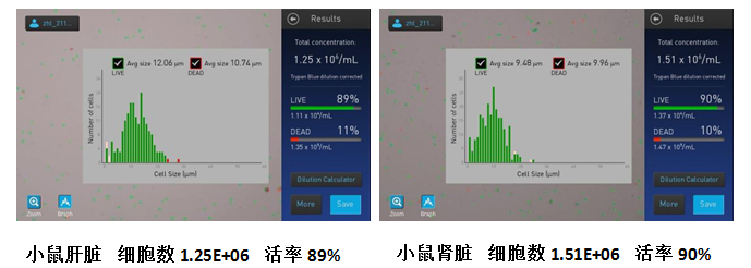 依靠丰富的项目经验,个性化的处理细节,高超的操作手法,开泰单细胞研发团队成功制备了小鼠肝脏、肾脏等组织单细胞悬液!一起来看质检结果~