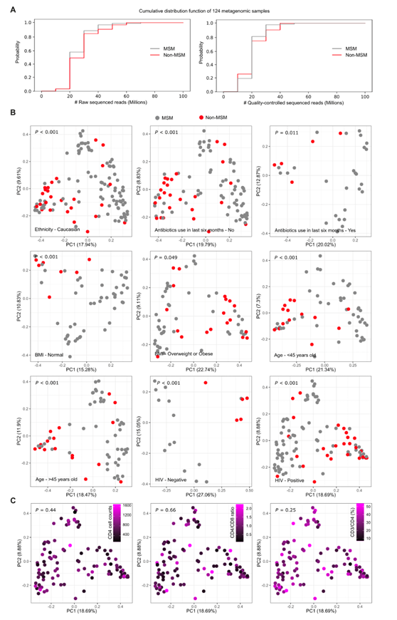 (A) MSM和非MSM样本中测序reads的累积分布函数。(B) 主坐标分析(PCoA)。(C) 基于HIV感染个体的Metaphan 4丰度谱的PCoA分析。