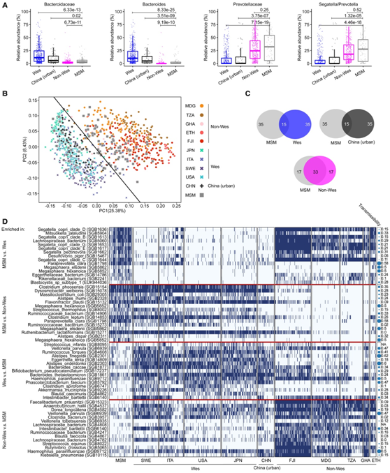 (A) MSM、西方化、非西方化和中国城市样本之间拟杆菌科和普雷沃氏菌科以及拟杆菌属和Segatella / Prevotella 属的丰度差异。(B) PCoA分析。 (C) 维恩图,分别显示 MSM 与西方化、非西方化和中国城市个体之间共有的和不同的物种数量。(D) 差异富集物种的存在-不存在的热图(蓝色,存在;白色,不存在)。