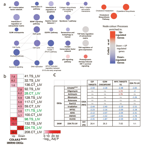 令人惊讶的是,尽管COL6A3down DEG显著富集,但细胞周期过程与SAM_CT.28_LIV基因无关(图5A)。细胞周期控制是衰老细胞的一个重要表型,这使他们假设COL6A3可能与SASP之外的其他衰老表型相关。