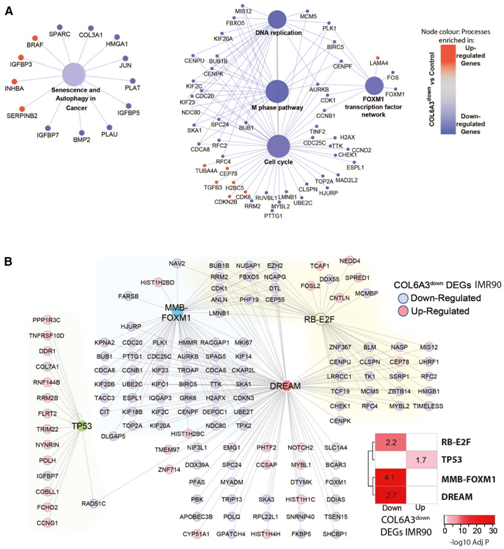 图5. IMR90 成纤维细胞中 COL6A3 敲低后的基因表达变化揭示了 DREAM 复合物在调节衰老细胞周期中的作用。