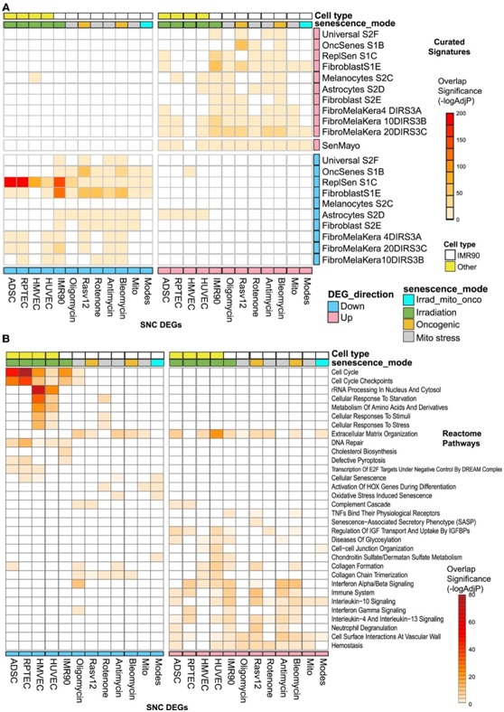 在本项研究的衰老HMVEC、HUVEC、ADSC和RPTEC的转录组中,富集的数量最少,包括称为“通用特征”(universal signature)(图2A中标记为universal S2F)的基因集(三个细胞系中的三个应激源)。一个例外是“复制性衰老特征”(在图2A中标记为ReplSen S1C),该特征在来自ADSC、RPTEC和IMR90细胞的衰老DEG中显著富集,提示复制性衰老和辐射诱导的分子表型之间有共性。相比之下,最近发表的基因集“SenMayo”特征(在图2A中标记为SenMayo)在对衰老细胞清除有反应的组织和物种中随着衰老而增加,并且在本研究上调的SNC-DEG特征系列中的所有基因中都有富集,证明了一个更普遍的特征。