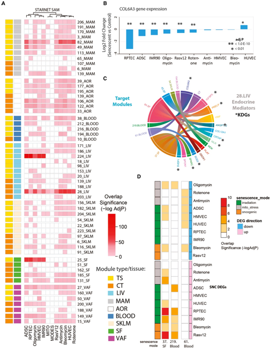 (A) 热图总结了衰老 DEG 中显著富集的跨组织 (CT) 和组织特异性 (TS) 模块。鉴定出 56 个衰老相关模块。(B) 衰老诱导对 28.CT_LIV SAM 和 COL6A3 的预测关键驱动基因表达的影响。(C) 显示 SAM、28.CT_LIV 及其目标模块的预测内分泌介质的和弦图。(D) 热图总结了三个 STARNET 模块(37_SF、219_Blood 和 61_Blood)中 10 个衰老 DEG 的富集重要性。
