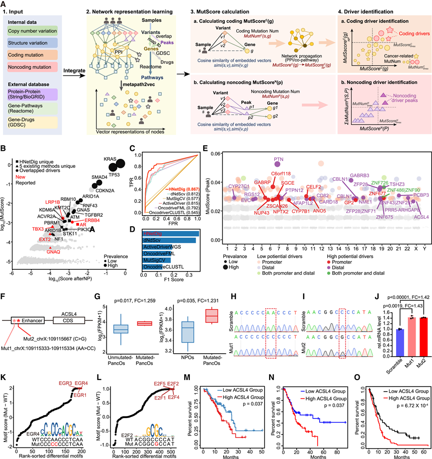 (A) HNetDig 识别整个基因组内的驱动基因和峰值的示意图。(B) 散点图显示在 HNetDig 和 5 种现有方法中检测到的编码驱动程序。(C) ROC 曲线比较了 HNetDig 与 5 种现有方法在检测定义明确的 PDAC 编码驱动方面的性能。(D) HNetDig 与 5 种现有方法的 F1 分数比较。(E) 曼哈顿图显示 HNetDig 检测到的非编码驱动峰和相应的基因。(F) 实验示意图。(G) 箱线图显示突变 PancO 与未突变 PancO(左)以及突变 PancO与 NPO(右)之间ACSL4的表达。(H-I) DAC-23 类器官系中ACSL4增强子区域中编辑位点的桑格测序图。(J) DAC-23 类器官系中 CRISPR-Cas9 编辑突变和混乱组中ACSL4的相对 mRNA 表达水平。(K-L) 野生型和突变型ACSL4非编码区中基序得分的差异。基序得分表示目标序列与相关基序之间的相似程度。(M-O) Kaplan-Meier 生存曲线分析。