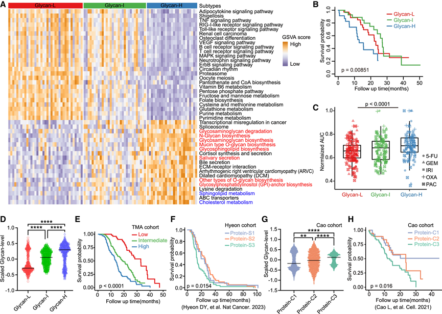 (A) 热图显示三种蛋白质组亚型之间具有差异 GSVA 富集得分的通路。(B) 三种蛋白质组亚型的总生存率 (OS) 的 Kaplan-Meier 生存曲线。(C) 5 种化疗药物在三种蛋白质组亚型中的标准化 AUC。(D) 三种蛋白质组亚型在糖基化位点水平上的糖水平(Z分值)比较。(E) 组织微阵列 (TMA) 中 OS 的 Kaplan-Meier 生存曲线。(F) Hyeon 队列三个亚组的 OS 的 Kaplan-Meier 生存曲线。(G) 糖基化位点水平上的糖水平比较。(H) 三个亚组的 OS 的 Kaplan-Meier 生存曲线。