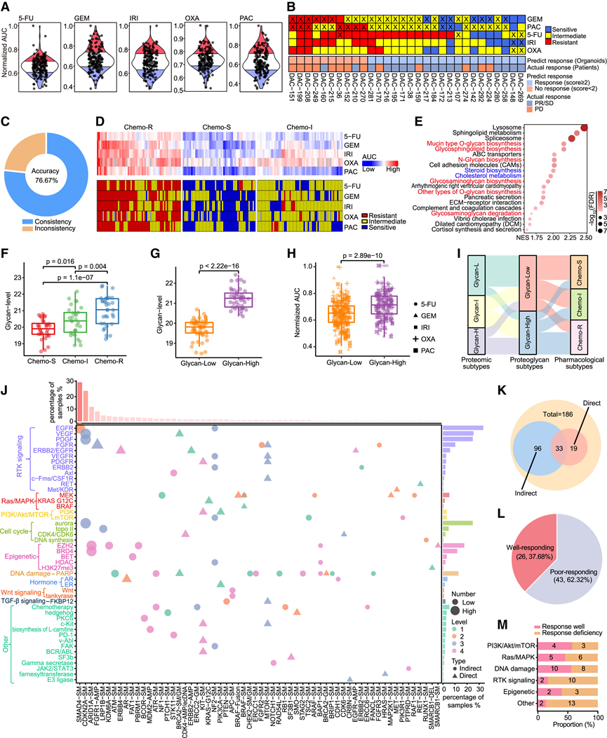 (A) PancO中 5 种化疗药物的 AUC 小提琴图。(B) 通过将预测结果与实际治疗反应进行比较,评估类器官药物敏感性评分预测治疗反应的准确性。(C) 类器官药物敏感性与患者临床结果的总体匹配率。(D) 热图(上)显示 5 种化疗药物的 AUC 曲线,这些药物分为三个亚型,热图(下)显示每种化疗药物的亚组。(E) 化学 R 亚型中前 20 条显著富集的通路。(F) 样本水平上三种药理亚型的蛋白质糖基化水平比较。(G) 样本水平上两种糖蛋白质组亚型的蛋白质糖基化水平比较。(H) 两种糖蛋白质组亚型中五种化疗药物的标准化 AUC 值。(I) 蛋白质组亚型、糖蛋白质组亚型和药理学亚型的分布。(J) 根据 OncoKB 和全癌症 CGI 证据等级,AGV 与药物靶点(根据靶向途径分类)之间的关系。(K) 饼图显示患有临床 AGV(直接或间接)的 PDAC 患者的比例。(L) 饼图显示反应良好的 AGV-药物对和反应较差的 AGV-药物对的比例。(M) 基于通路反应良好的 AGV-药物对和反应较差的 AGV-药物对的比例。