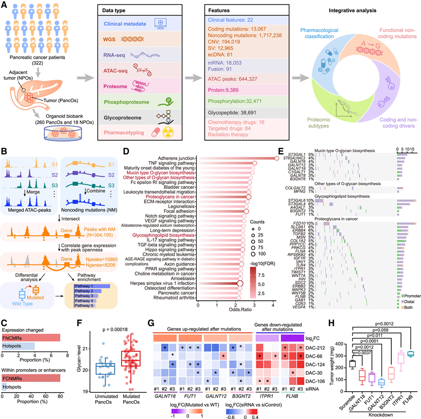 (A) 示意图显示了本研究中生成的数据和元数据的摘要。(B) 全基因组检测 FNCMR 的工作流程。(C) 突变样本与野生型样本中相应基因表达是否发生显著变化的热点和 FNCMR 比例(上)以及是否位于H3K27ac 或 H3K4me3 ChIP-seq 峰中(下)。(D) 通过通路富集分析,从与FNCMR相关的基因中识别PDAC调控过程。(E) 蛋白聚糖相关通路中FNCMR的突变图。(F) 样本水平上蛋白多糖相关通路突变型和野生型样本的蛋白质糖基化水平比较。(G) (H) 所示shRNA对DAC-30原位移植模型中肿瘤生长的影响。
