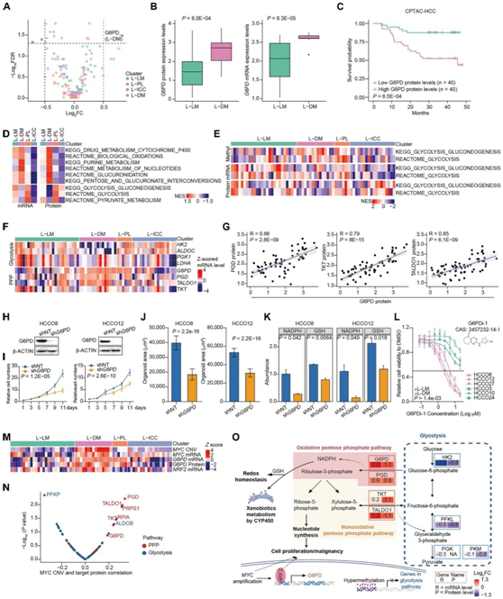 (A) LICOB 亚型中潜在药物靶点的差异表达蛋白。(B) L-LM 与 L-DM 中的 G6PD 蛋白和 mRNA 表达。(C) 基于 CPTAC HCC 数据集中 G6PD 蛋白的下分位数和上分位数表达的 Kaplan-Meier 总生存曲线。(D) LICOB 聚类中指示路径的 ssGSEA 评分。(E) 糖酵解通路的 ssGSEA 评分。(F) 每个 LICOB 样品中 PPP 和糖酵解相关基因的 mRNA 表达。(G) G6PD 表达与每个所示蛋白质之间的 Pearson 相关性。(H) 使用G6PD沉默 (sh-G6PD ) 或对照 (sh-NT) 对来自 L-DM 的 HCCO8 和 HCCO12 中的 G6PD 进行免疫印迹分析。(I) 指定类器官的增殖。(J) 指定类器官的面积。(K) 箱线图展示了指定类器官中的指定代谢物。(L) L-LM 和 L-DM 类器官 G6PD 抑制的剂量反应曲线。(M) LICOB 亚型中选定的多组学特征。(N) MYC CNV 与糖酵解(蓝点)和 PPP 通路(红点)的蛋白质表达之间的 Spearman 相关性,并标记了显著相关的基因。(O) 示意图描绘了 G6PD 在 L-DM 代谢变化中的功能。