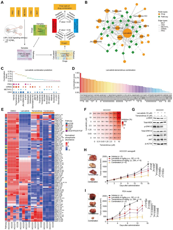 (A)药物组合预测的工作流程。(B) 乐伐替尼的药物通路网络图。橙色节点代表预测药物与乐伐替尼的组合效率,节点大小表示与乐伐替尼的组合分数。绿色节点表示连接每对药物组合的通路。(C) 乐伐替尼与其他药物联合使用的预测评分。点的大小代表不同组学数据贡献的分数。(D) 所有 LICOB 样本的乐伐替尼和替西罗莫司组合的预测评分。(E) 热图显示用指定药物处理的类器官中磷酸化位点的标准化丰度。(F) 热图显示 HCCO31 中乐伐替尼-替西罗莫司组合的剂量反应矩阵。(G) MEK-ERK 级联和 AKT 激活的免疫印迹分析。(H-I) HCCO31 和乐伐替尼耐药 PDX 模型异种移植模型中药物对肿瘤生长的功效。