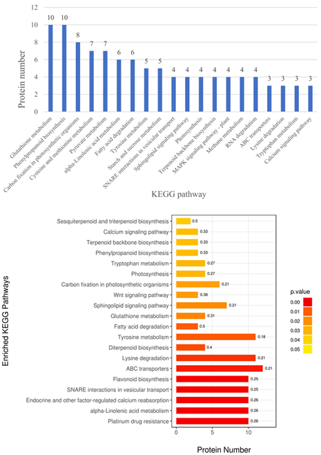 在生物体中,蛋白质并不是独立地执行其功能的。相反,不同的蛋白质相互协调,共同完成一系列的生化反应,以执行它们的生物学功能。因此,通路分析是系统、全面地了解生物过程,以及疾病的发生机制和药物作用机制最直接、最必要的途径。对显著差异表达蛋白进行KEGG通路注释分析,可以帮助我们了解这些蛋白参与的代谢或信号通路,展示蛋白从细胞表面到细胞核的一系列变化过程,解释参与该过程的一系列生物学事件和效应因子。通过Fisher精确检验对DEPs进行KEGG通路分析(图 4)。从图4A可以看出,与植物代谢相关的DEPs主要参与谷胱甘肽代谢、苯丙素生物合成、光合生物的碳固定、半胱氨酸和蛋氨酸代谢以及丙酮酸代谢等。富集分析发现,在重金属处理下,铂类耐药性、α-亚麻酸代谢、钙重吸收的内分泌等因子调控、囊泡运输中的SNARE相互作用、类黄酮生物合成、ABC转运蛋白和赖氨酸降解均存在显著差异。