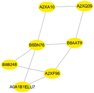 此外,参与Zn2+和Cd2+转运的7个DEPs在GO分析和KEGG通路中得到注释。其中,4个DEPs (A2XQ09、B8AAT9、B8AB68、B8BN76)参与氧化磷酸化,4个DEPs (A2XQ09、B8AAT9、B8AB68、A2XPS1)具有质子转运ATP酶活性。此外,B8B248、B8BN76和A0A1B1ELU7参与了重金属离子的结合和转运。PPI网络分析显示,在鉴定到的7个DEP中,有5个是相互作用的(图 5)。所有这些功能表明,鉴定的PM蛋白在调控重金属离子的跨膜转运、抵御重金属胁迫和缓解重金属对植物的毒害等方面发挥着非常重要的作用。后续该团队又通过PRM分析验证iTRAQ筛选到的具有潜在离子转运功能的候选蛋白。