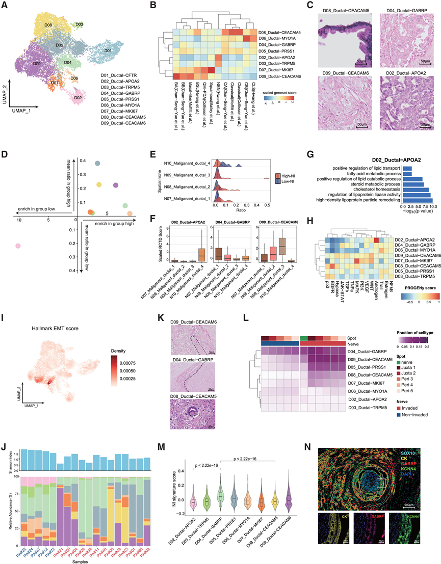(A) 导管细胞亚聚类的 UMAP 可视化。(B) 已注释恶性肿瘤亚聚类(标签,行)与先前已发表特征(标签,列)的相似性。按基因集评分进行着色。(C) H&E染色显示4个恶性亚聚类的形态特征。(D) 坐标图显示恶性亚群的相对丰度。(E) 脊线图显示了整个剖面中空间微环境的比例。(F) 箱线图显示恶性导管_1-4微环境内导管细胞亚群的比例。(G) 通过 GO 富集分析,发现 D02_Ductal−APOA2 通路富集。(H) PROGENy 通路评分(标签,列)在恶性亚聚类(标签,行)中的热图。(I) 密度散点图将标志性的 EMT 基因集富集得分转换为密度得分,并映射到 UMAP 维度。(J) 底部条形图通过 ST 数据分析显示了样本间恶性亚聚类的组成情况。顶部条形图显示了每个样本恶性导管亚聚类的 Shannon 多样性指数。(K)H&E 染色显示神经侵袭性导管细胞的形态特征,分别对应 D09_Ductal-CEACAM6(上)、D04_Ductal-GABRP(中)和 D08_Ductal-CEACAM5(下)。(L)侵袭性或非侵袭性神经周围(从距神经边缘5个点到神经近侧最近的点)及侵袭性神经内部恶性亚聚类的比例。(M) 小提琴图显示恶性亚群中NI相关基因评分。