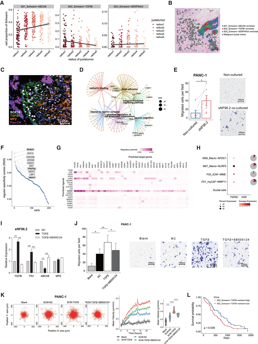 (A) 散点图描绘了三个Schwann细胞亚聚类在距离恶性导管微环境不同距离的斑点中的分布。(B) 高NI代表性样本PA#98中三个Schwann细胞亚群的空间分布。(C) mIHC 染色分析。(D) 基因概念网络图。(E) 条形图显示迁移的 PANC-1 细胞数量。(F) 散点图显示 S02_Schwann-TGFBI 细胞的调控子特异性得分 (RSS)。(G) NicheNet 配体-靶点矩阵热图。(H) 气泡热图显示TGFB1和HGF在 4 个潜在 TME 亚群和导管细胞中的表达情况。(I) 通过 qPCR 定量分析TGFBI、FN1、ABCA8和MPZ基因的相对表达。(J) 条形图显示向用 20 ng/mL TGF-β 或 20 ng/mL TGF-β 与 1 μM SB505124 联合处理的 sNF96.2 细胞迁移的 PANC-1 细胞数量。(K) 用 sNF96.2 上清液处理的 PANC-1 细胞的随机迁移试验。(L)Kaplan-Meier (KM) 曲线显示 S02_Schwann−TGFBI 特征基因表达与已发表队列预后之间的关联。