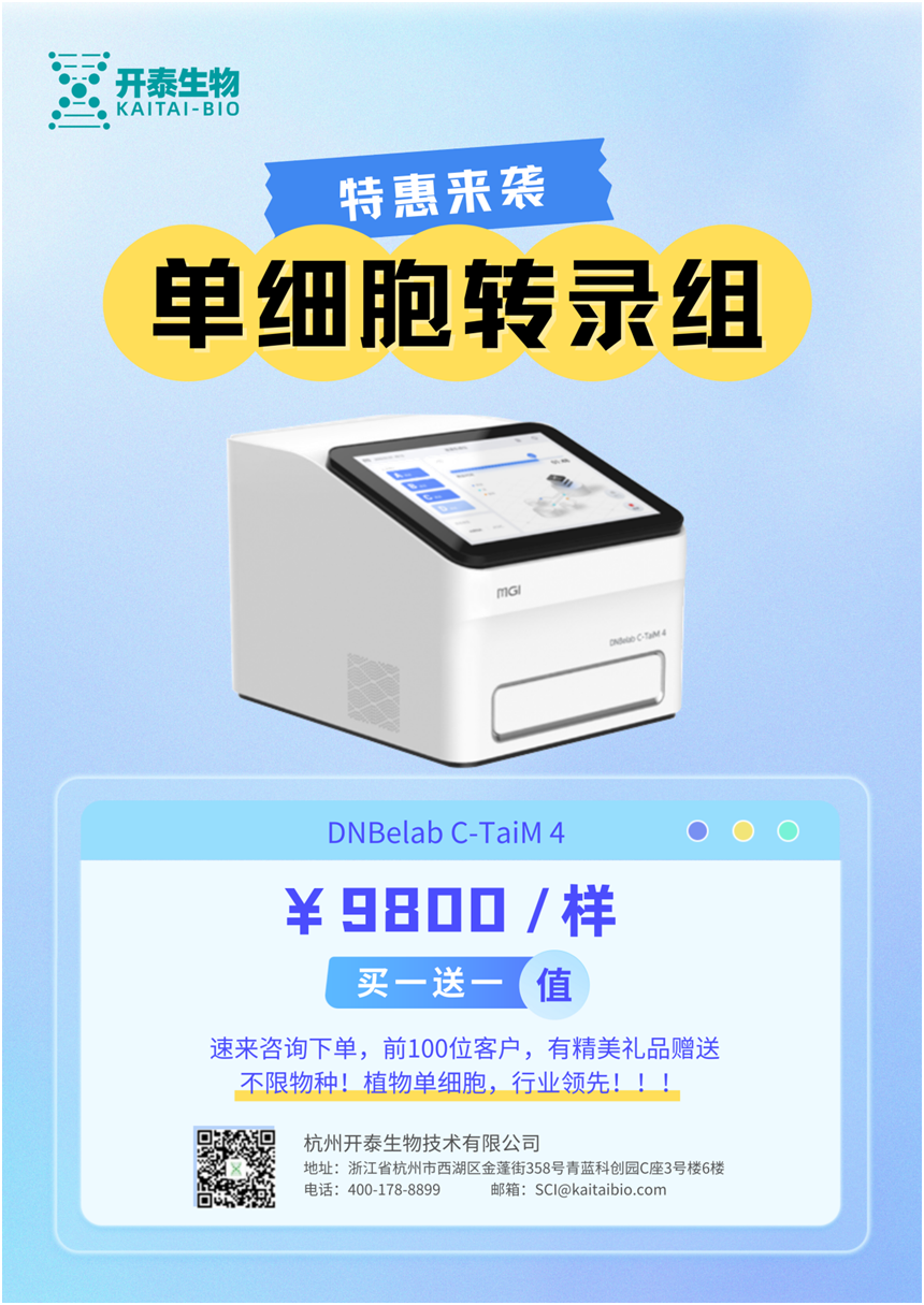 为助力国内生命科研,华大智造联合开泰生物推出特惠单细胞测序服务,仅需9800元就能享受买一送一的单细胞转录组测序服务!超值特惠,送给科研路上奋斗的你,速来咨询下单,前100位客户,更有精美礼品赠送~~