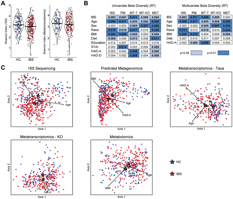粪便样本通过16S rRNA基因测序、宏转录组测序和非靶向整体代谢组学进行分析。微生物组成通过16S rRNA基因丰度和测序转录本的分类分配来评估。利用Shannon丰富度和均匀度指数比较IBS和HC之间的Alpha多样性(即样本内多样性)。通过非参数检验和多元线性模型,两组数据集的Shannon指数均无显著差异(图1A)。相比之下,使用布雷-柯蒂斯差异进行的Beta多样性分析(即样本间的多样性)显示,IBS和HC之间的16S rRNA谱和宏转录组学分类在组成上存在统计学显著差异(图1B)。鉴于焦虑和抑郁之间存在很强的相关性,并且医院焦虑和抑郁 (HAD)评分在 IBS 和 HC 之间存在较大差异,因此选择此作为协变量来代表情绪与微生物组的关联。在调整这些协变量的多变量分析中,通过 16S rRNA 测序和宏转录组分析,IBS 仍然与微生物组成显著相关,包括年龄和种族在内的几个协变量也是如此(图 1 B-C)。