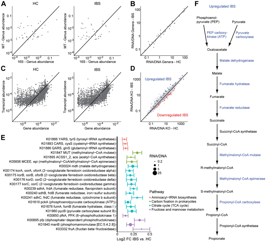 (a) 散点图描绘了具有两种数据类型的 322 名受试者的 16S rRNA 测序数据和宏转录组中属的中位相对丰度。 (b) IBS 受试者和 HC 宏转录组 (RNA) 与16S rRNA 测序数据 (DNA) 中属的丰度的中位数比率。(c) 预测宏基因组中基因丰度中值与转录本丰度中值相比的散点图。 (d) 绘制 IBS 受试者和 HC 的中位转录本/基因丰度比。(e) 鉴定出差异调节转录本显著富集的通路。 (f) 碳水化合物发酵的琥珀酸通路。